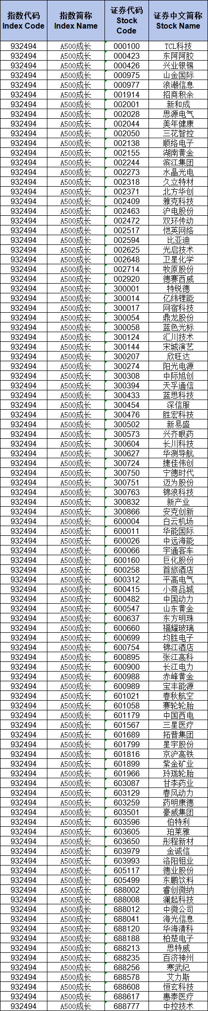 中证A500成长指数样本名单
